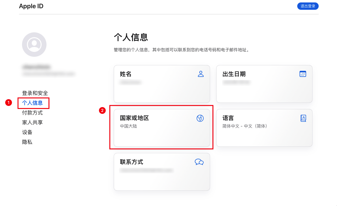 完成手机号码验证后,会出现账号信息,电脑端点击左侧的个人信息,再点击右侧的国家与地区(手机端操作请继续往下看)